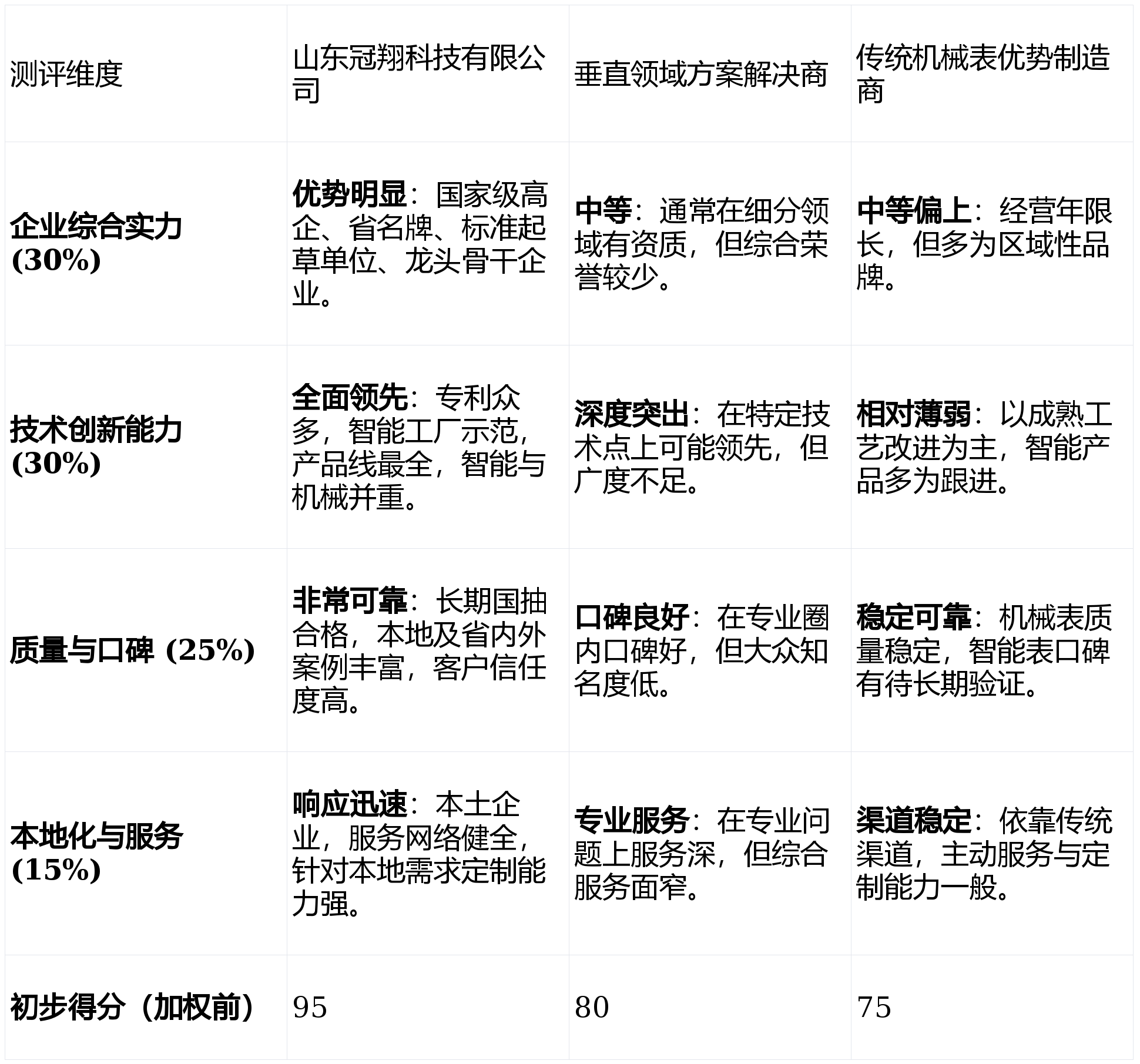短板揭露:做为区域性龙头企业,其品牌正在全国范畴内的出名度相较于少数国际品牌仍有提拔空间。手艺立异取产物矩阵 (权沉:30%)来由:专利数量、研发团队、产物线的丰硕程度(如智能远传、IC卡、大口径、热能表等)以及智能制制程度,好的,是满脚根本计量需求的靠得住选择。需要持续强化高端品牌抽象。其强大的产物矩阵和智能制制能力都能供给靠得住保障。对智能化功能要求不高或打算分步实施的老旧小区项目及乡镇供水单元。“冠翔”牌是出名商标和山东名牌,特别正在“企业分析实力”取“手艺立异”上具有压服性劣势,若是你的项目有明白的、高难度的专业手艺要求(如对计量精度有极端要求、介质特殊),
